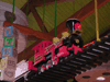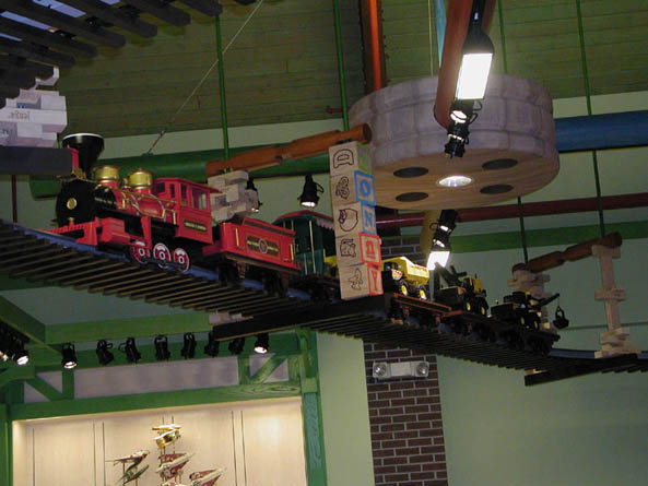 New toys, games and collectibles that combine the magic of Disney and the fun of Hasbro fill the colorful shelves of Once Upon a Toy Store, a playful shopping destination at Walt Disney World Resort designed as the ultimate toy store where kids and families can play together. Located at Downtown Disney Marketplace, the store offers five uniquely themed rooms that add up to 16,000 square feet of fun. Inside, the store's spacious interior is bursting with whimsical touches and kinetic displays in all corners, including a ceiling-mounted spinner from "The Game of Life", a rotating conveyor bearing dozens of toys and games, and a child-size version of the Walt Disney World Railroad that travels a winding track suspended from the ceiling. The model train consisting of a locomotive, tender, and four rail cars, was constructed three times larger than the size of the toy train that Disney sells, and it was built around a beam crawler to transverse the track work that was suspended from the ceiling.